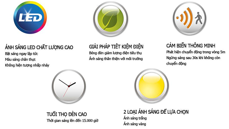 - Philips 62233 Danta 65K Sensor LED sử dụng cảm biến chuyển động với khoảng cách nhận biết tối đa là 5m và có góc nhận cảm biến là 120 độ, rất tiện dụng cho người dùng trong quá trình sử dụng sản phẩm.