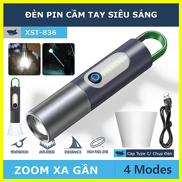 Đèn pin cầm tay siêu sáng chiếu xa 200m Zoom xa gần, Đèn pin Led cầm tay có móc treo, pin trâu, chống thấm nước IPX4-XST836 - Hàng chính hãng