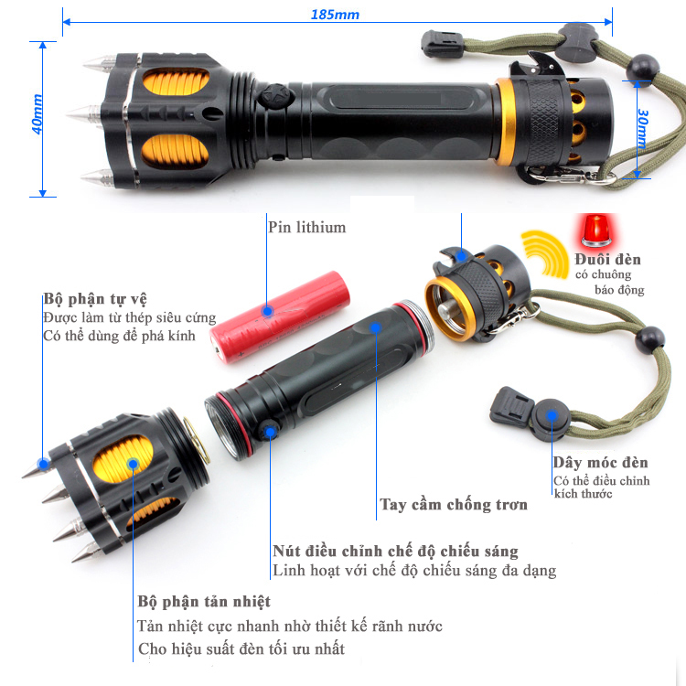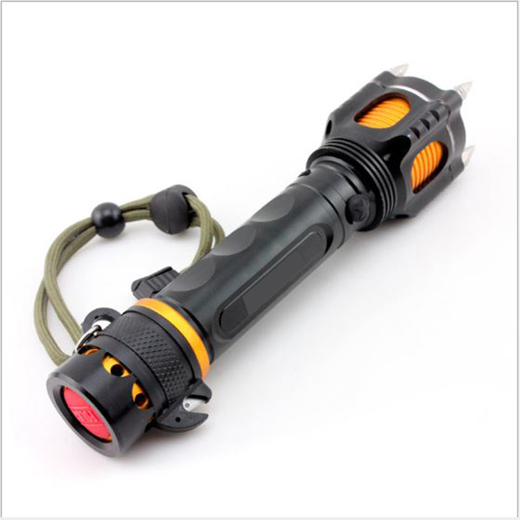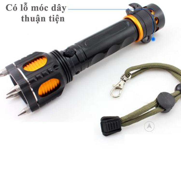 Đèn pin được thiết kế đa năng với đầu đèn có 4 chốt nhọn để phá kính khi cần thoát ra khỏi xe hơi, ô tô. Cuối tay cầm của đèn còn có 1 dao nhỏ để cắt dây trong trường hợp cần thiết.