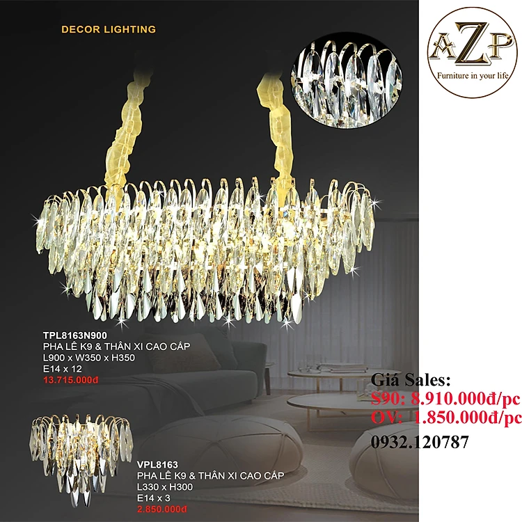 ĐÈN THẢ TRẦN PHA LÊ / ĐÈN THÔNG TẦNG TRANG TRÍ PHÒNG KHÁCH / PHÒNG NGỦ / CẦU THANG / KHÔNG GIAN SANG TRỌNG AZP-8163 phong cách đương đại, hàng nhập khẩu AZP
