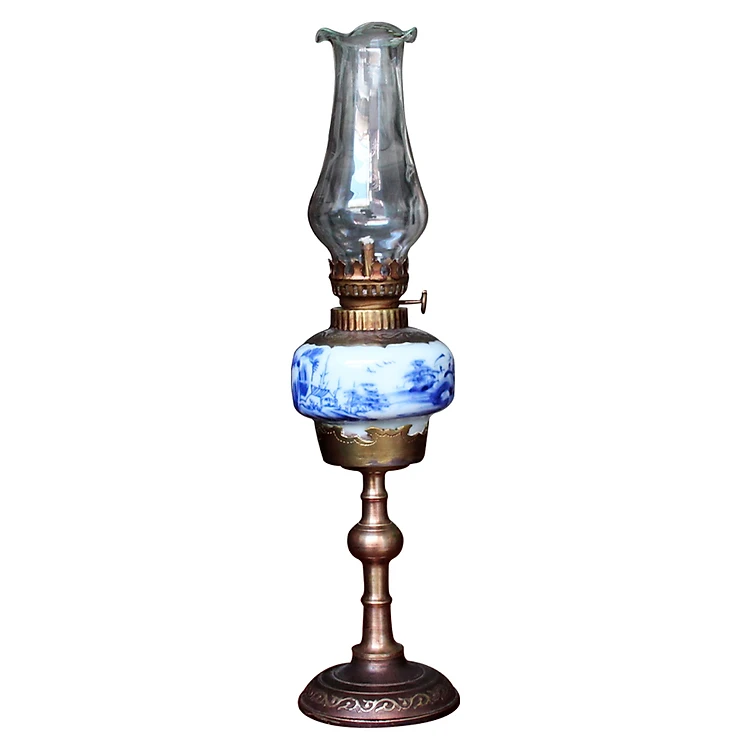 Đèn thờ dầu men lam vẽ Sơn Thủy dáng trụ chân đồng gốm sứ Bát Tràng (đèn dầu, đèn thờ cúng)