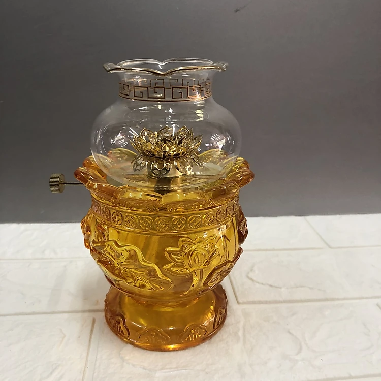 Đèn thờ đốt dầu - cao 17cm - thuỷ tinh cao cấp mẫu hoa sen nổi