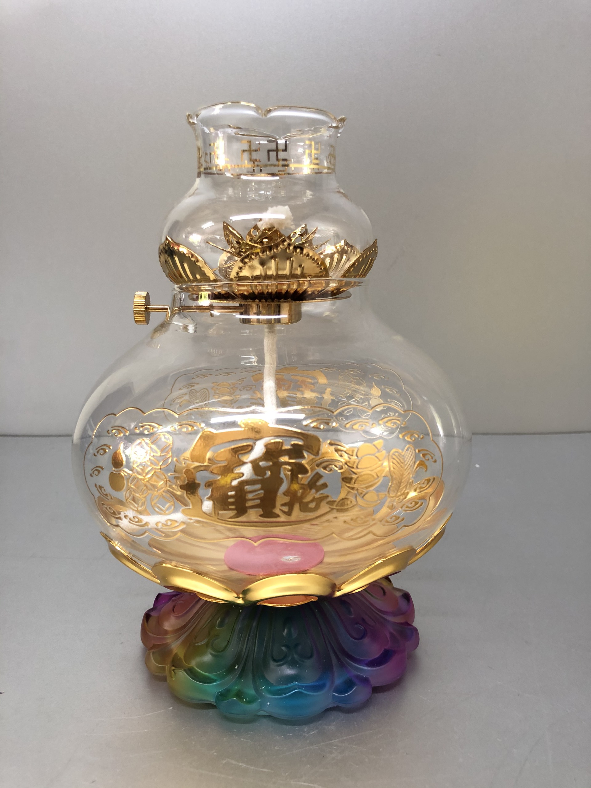 Đèn thờ đốt dầu đế lưu li ngũ sắc hoạ tiết chữ Lộc