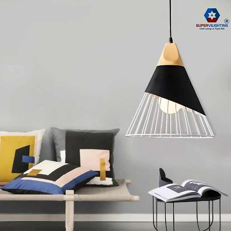 Đèn treo thả trần trang trí phòng khách đầu giường chuôi gỗ hiện đại đen trắng