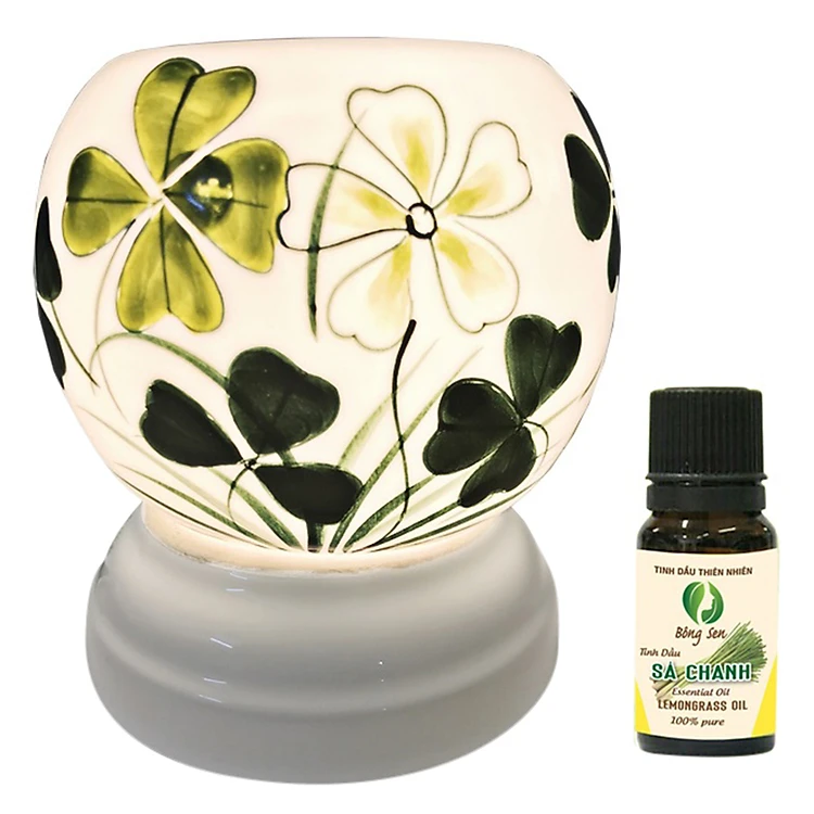 - Đèn Xông Tinh Dầu Gốm Bát Tràng Tứ Diệp Thảo có hoạ tiết tứ diệp thảo mang ý nghĩa may mắn, sản phẩm là của làng nghề gốm sứ Bát Tràng nổi tiếng với chất liệu gốm thấu quang chịu nhiệt.