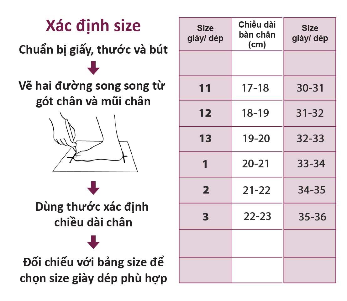 Size 01: Tương ứng size 33 - 34 VN - Chiều dài chân 20 - 21 cm