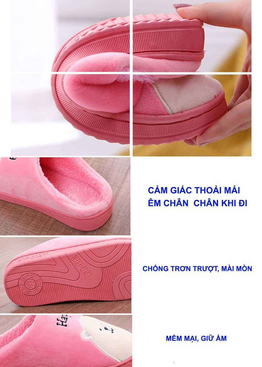 - Dép được làm 100% từ Cotton, đế làm bằng cao su mềm, bề mặt được phủ bằng lớp nhung mềm mại, êm ái, đem lại cảm giác thư thái, êm ái cho bạn