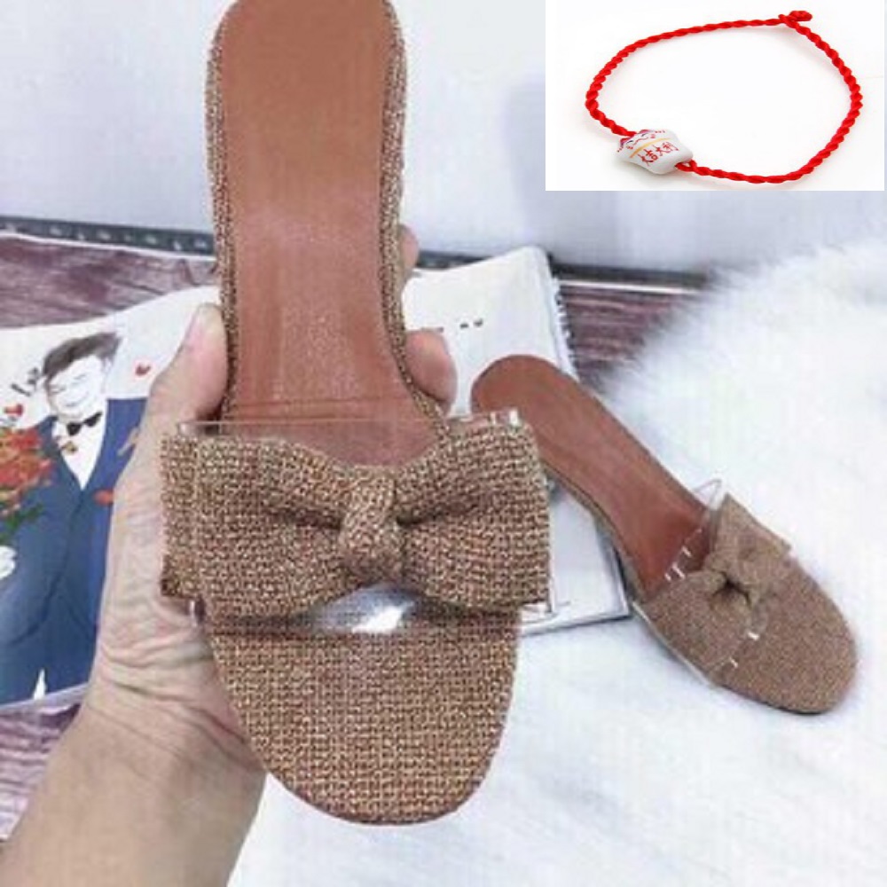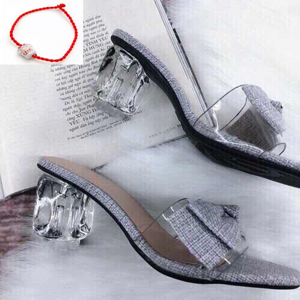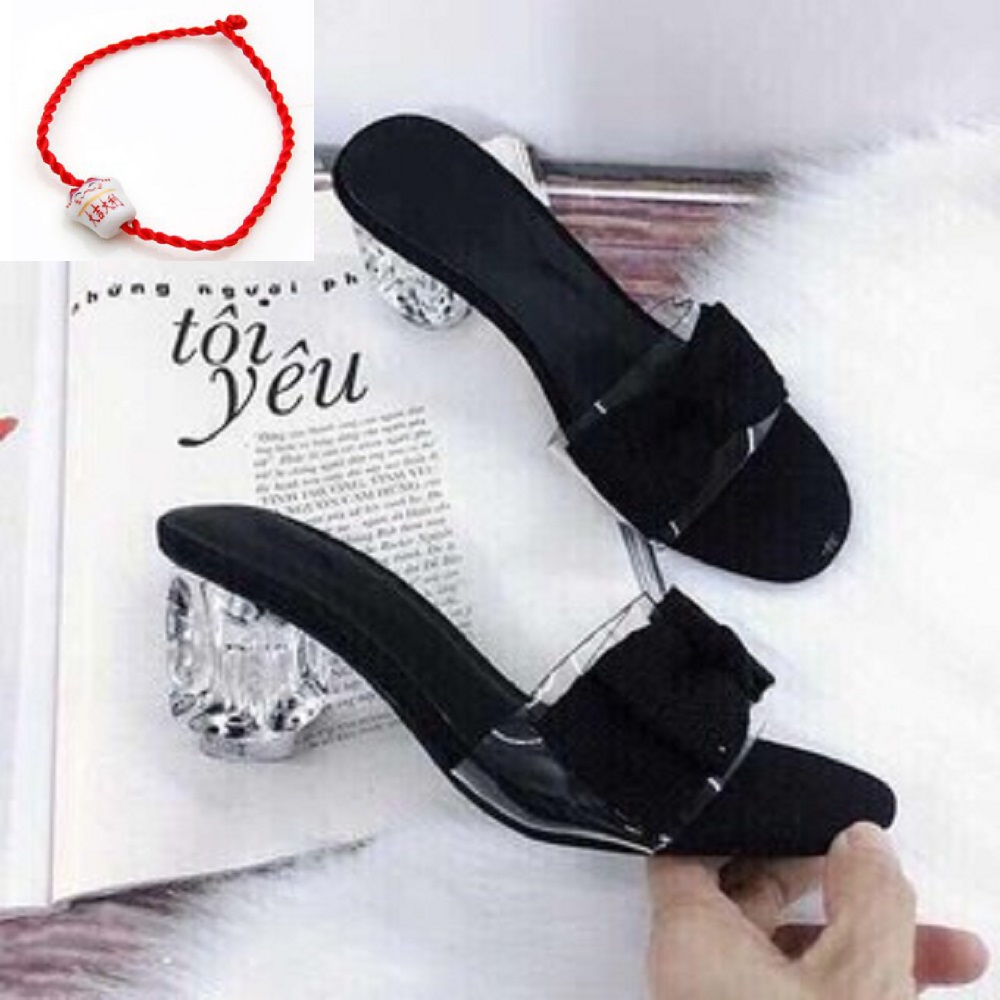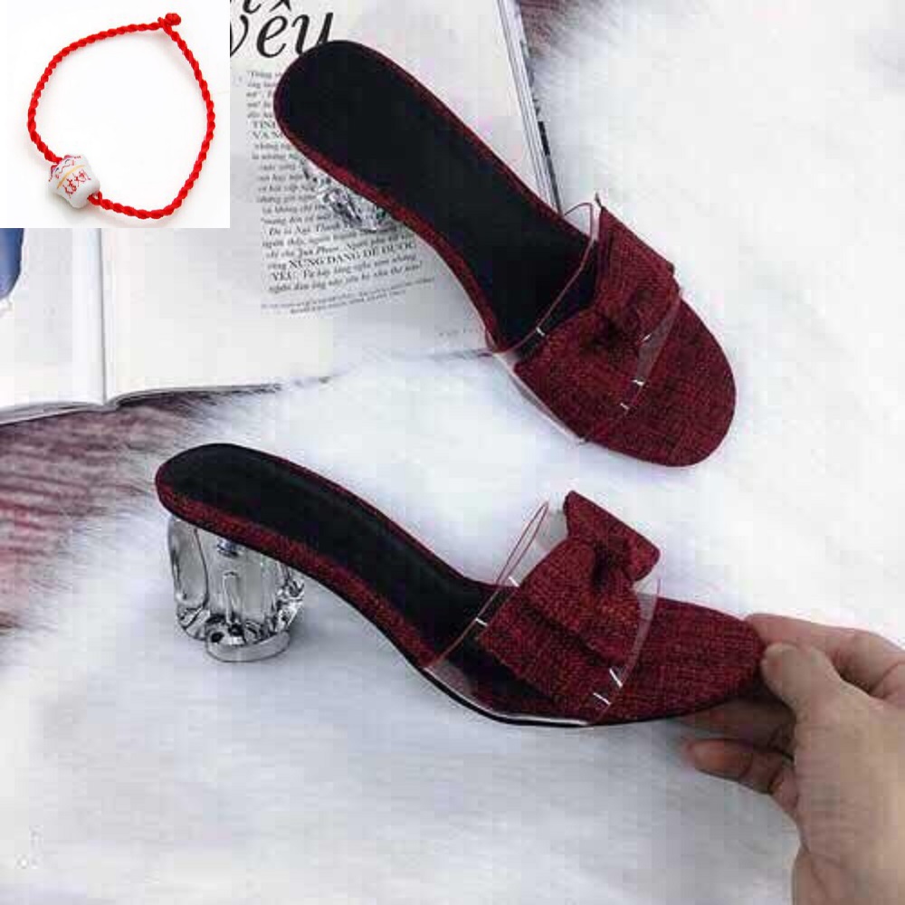 Dép Guốc Nữ Đẹp Đế Vuông Trong Suốt Cao 5 Cm Phối Nơ Cực Xinh Phong Cách Hàn Quốc ( Tặng vòng chỉ đỏ Mèo gốm may mắn).