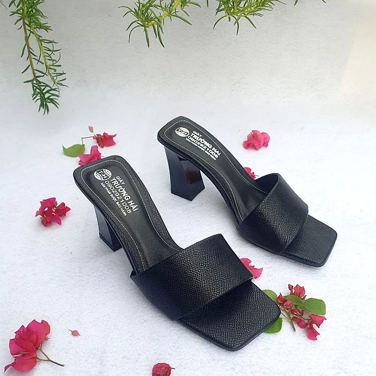 Dép nữ cao gót quai ngang một bản TRường Hải màu đen gót vuông 8cm da mềm DN139