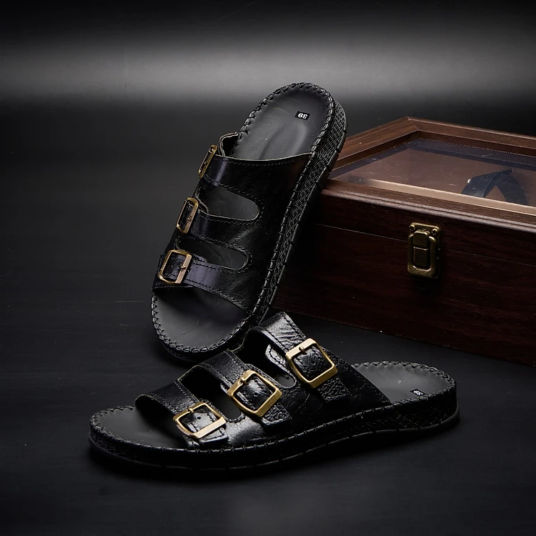 Dép Nam Quai Ngang Da Bò 3 Quai Khóa Đồng Sang Trọng Phong Cách Trẻ Trung Tiện Lợi Êm Chân