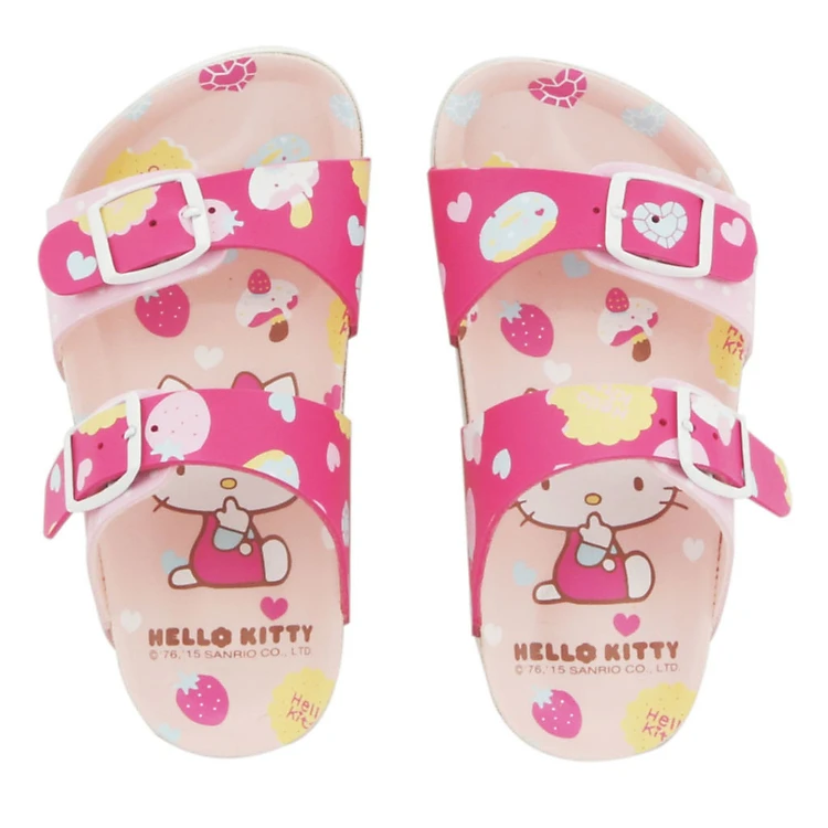 - Thiết kế 2 quai dép ngang bản mảnh vừa cố định chân tốt vừa đẹp mắt. Bề mặt dép in hình mèo Kitty cùng dâu tây, trái tim ngọt ngào mang đến vẻ dễ thương cho các bé gái.
