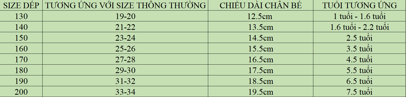 Để chọn size cho bé, mẹ vui lòng đo chiều dài chân con từ ngón chân dài nhất xuống tới gót chân, rồi đối chiếu kích thước với bảng dưới để lựa chọn size phù hợp. Đối với các bé có bàn chân dày hoặc bề ngang rộng các mẹ nên lấy tăng lên 1 size nhé. Lưu Ý: Cột tuổi chỉ mang tính chất tham khảo thêm, chính xác nhất vẫn là dựa vào chiều dài chân bé để lấy size các mẹ nhé.
