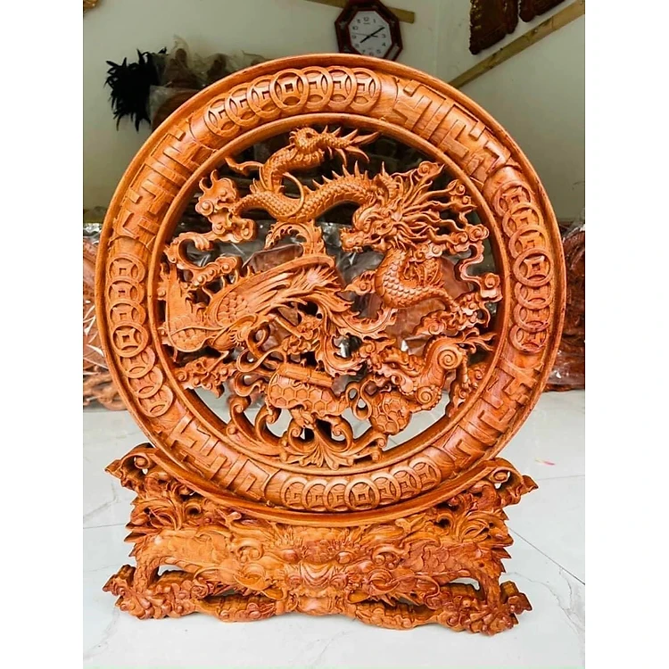 Đĩa trạm khắc tứ linh trang trí phong thủy bằng gỗ hương đá kt mặt tròn 40×4cm