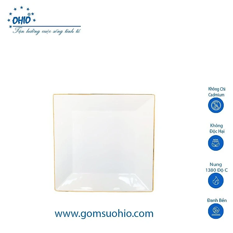Đĩa Vuông 20.5cm Sứ Trắng Viền Kim OHIO Hàng Việt Nam Chất Lượng Cao.