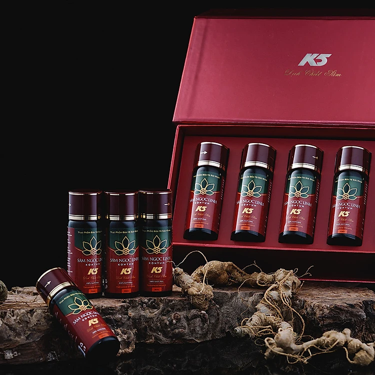 - Chiết xuất từ củ Sâm Ngọc Linh trên 10 năm tuổi - Nước tinh khiết - Không đường - Không chất bảo quản