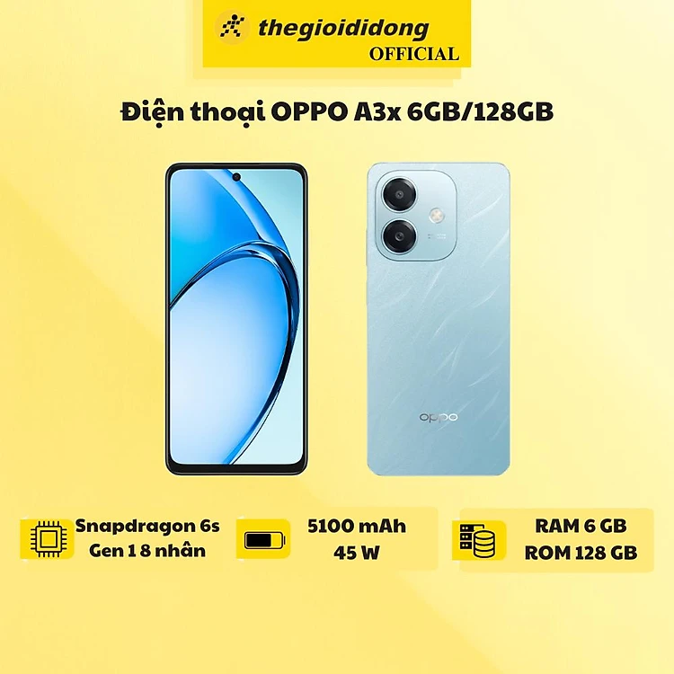 OPPO A3x là chiếc điện thoại lý tưởng với thiết kế bền bỉ, màn hình sắc nét, hiệu năng mạnh mẽ từ vi xử lý Snapdragon thế hệ mới. Kết hợp với pin 5100 mAh, kháng nước, sạc nhanh 45W và camera thông minh, giúp đáp ứng tối ưu mọi nhu cầu hằng ngày của người dùng.