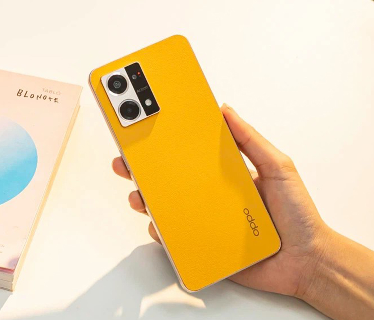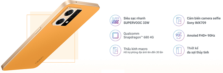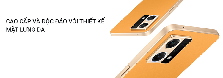Điện Thoại Oppo Reno 7 4G có thiết kế đặc biệt khi sở hữu mặt lưng làm bằng chất liệu da sợi thủy tinh, cụm camera kim loại cao cấp. Máy có hai màu đó là đen và cam, thân mỏng chỉ 7.49 mm, trọng lượng nhẹ chỉ 175 gram, khung vuông hiện đại.