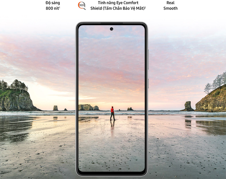 Điện Thoại Samsung Galaxy A72 (8GB/256GB) mang lại hình ảnh mãn nhãn với những hình ảnh chi tiết, rực rỡ trên màn hình Super AMOLED chuẩn FHD+ với độ sáng lên đến 800 nit1, luôn sắc nét kể cả khi sử dụng dưới trời nắng gắt.