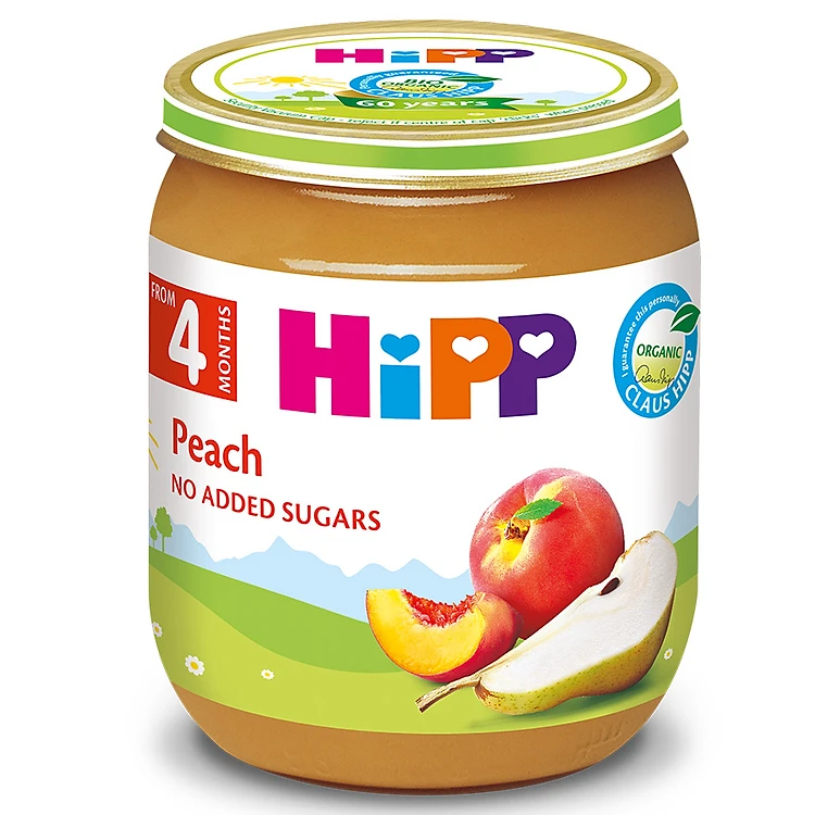 Dinh Dưỡng Đóng Lọ Đào Tây HiPP 125g - 4202 chứa 90% trái cây (đào tây 75%, táo 10% nước, nước ép nho cô đặc), tinh lõi gạo, tinh bột gạo, Vitamin C giúp tăng sức đề kháng và hỗ trợ quá trình phát triển của trẻ.