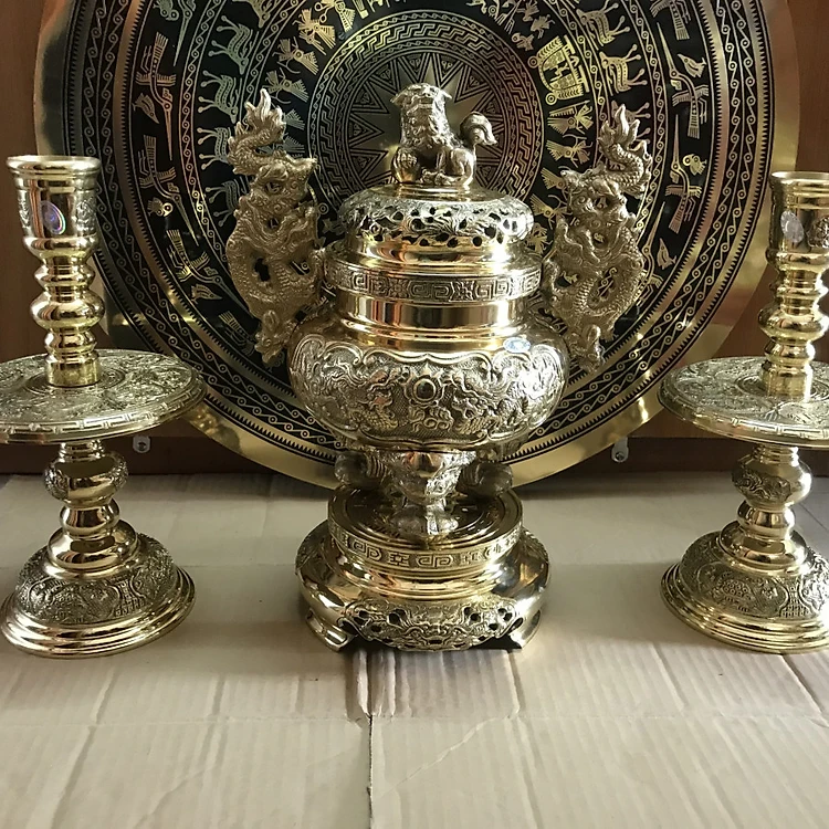 Bộ đỉnh tam sự gồm một đỉnh +hai Nến hoặc hai hạc . Đỉnh thuộc dạng đỉnh tròn tai rồng, bụng đúc nổi hình cặp rồng chầu. Trên nóc đỉnh là biểu tượng kì lân cầu phúc. Chân nến đúc nổi họa tiết. Bộ đỉnh làm từ nguyên liệu đồng vàng. Bề mặt được xử lí màu sang trọng chống oxi hóa