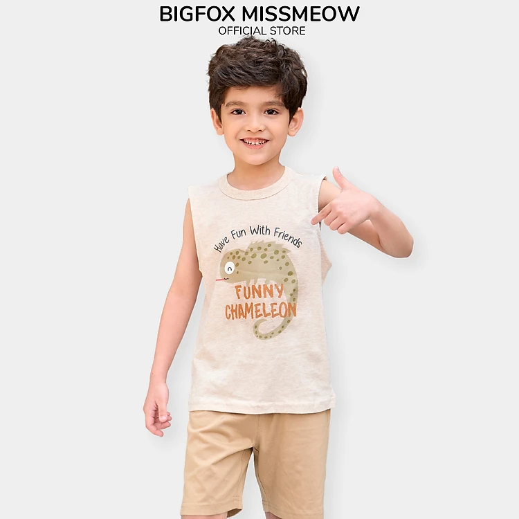 Đồ bộ ba lỗ bé trai size đại Bigfox áo sát nách quần đùi cho bé kiểu Hàn Quốc in Khủng long Funny cỡ 3-11 tuổi 30kg 40kg
