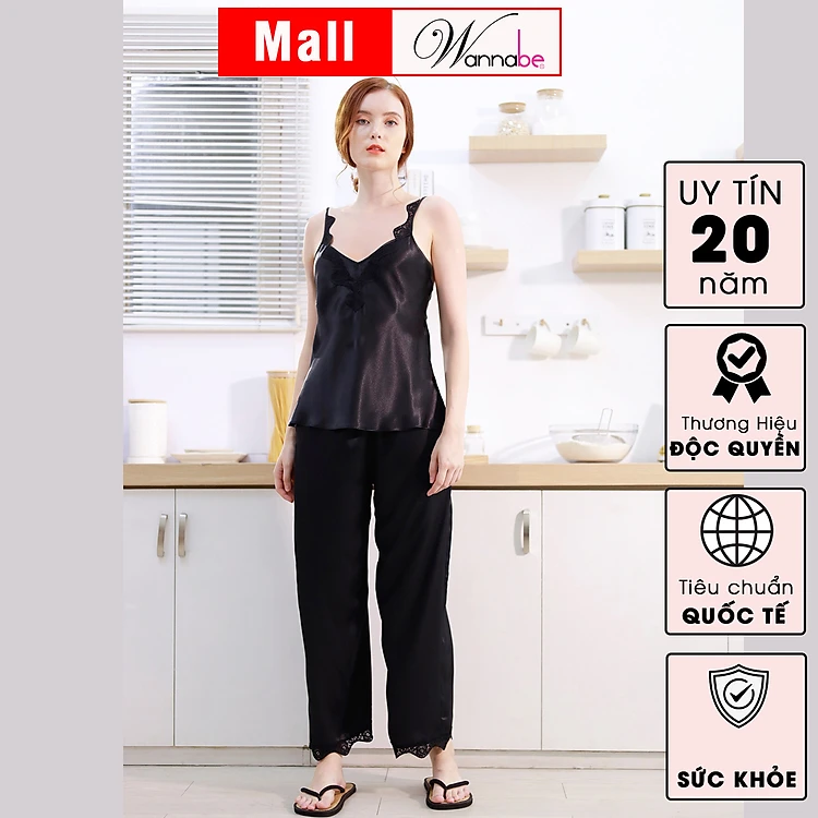 Đồ bộ mặc nhà WANNABE BDS39 đồ bộ quần dài phối áo viền ren dây vai cổ tạo nên vẻ đẹp nữ tính cho người mặc