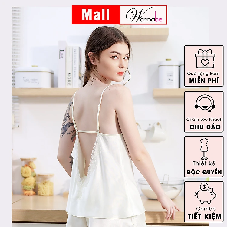 Đồ bộ mặc nhà WANNABE BDS39 đồ bộ quần dài phối áo viền ren dây vai cổ tạo nên vẻ đẹp nữ tính cho người mặc