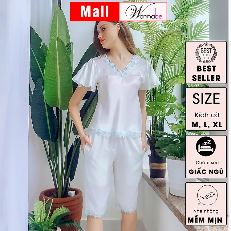 Đồ bộ mặc nhà phi lụa WANNABE BLS08 đồ bộ quần lửng và áo tay chuông điệu đà ren cổ áo nữ tính