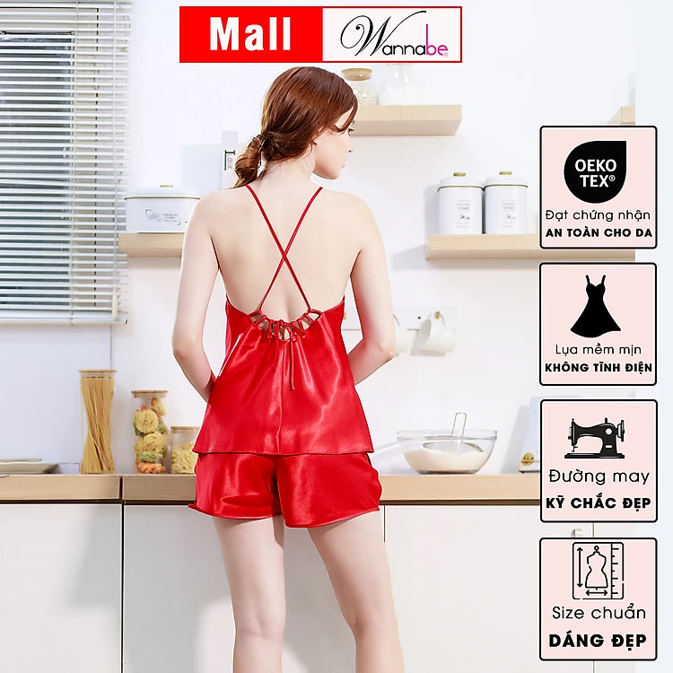 Đồ bộ mặc nhà phi lụa cao cấp WANNABE BSS33 đồ bộ quần sọt đan dây mặc với áo 2 dây cổ yếm lưng trần dây kiểu xinh xắn