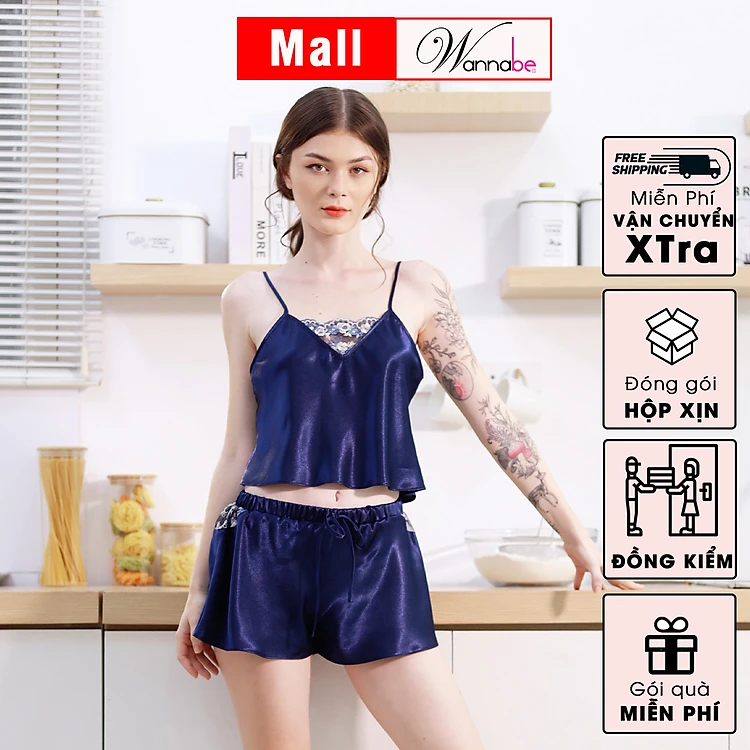 Đồ bộ mặc nhà lụa cao cấp WANNABE BSS62 đồ bộ quần sọt áo hai dây cổ áo phối ren thêu Nhật hình tam giác nhẹ nhàng