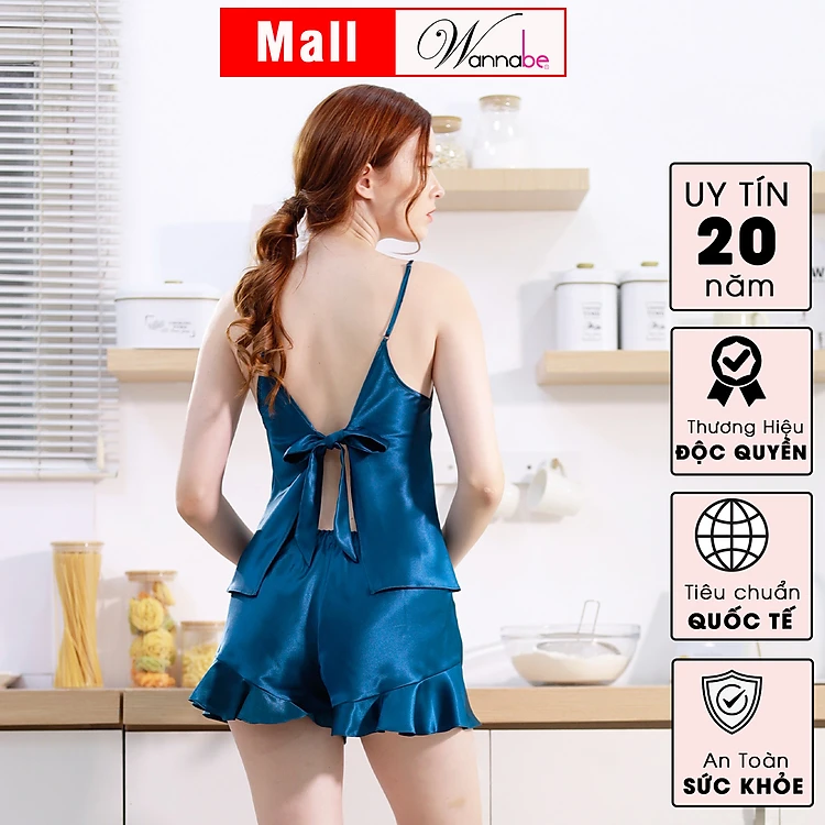 Đồ bộ mặc nhà phi lụa cao cấp WANNABE BSS63 đồ bộ quần short phối áo 2 dây cutout lưng cột nơ sexy giúp bạn gái xinh xắn