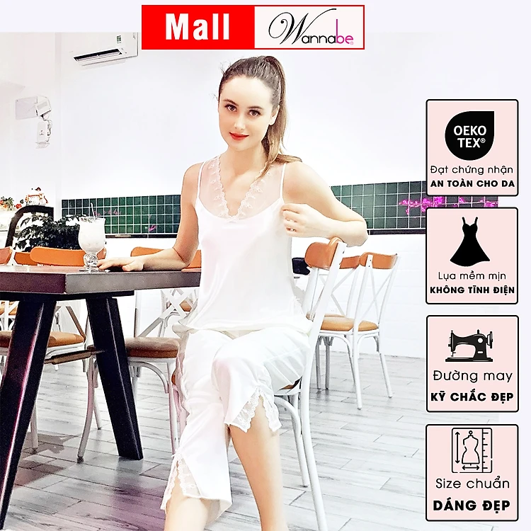 Đồ bộ mặc nhà phi lụa Wannabe, bộ dài bds04 viền ren hoa nữ tính, sang trọng