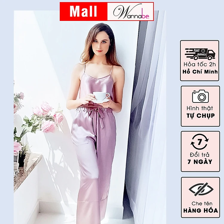 Đồ bộ mặc nhà phi lụa WANNABE BDS07 bộ dài áo croptop, quần dài ống suôn thắt nơ eo, áo ba lỗ lưng ren xinh đẹp