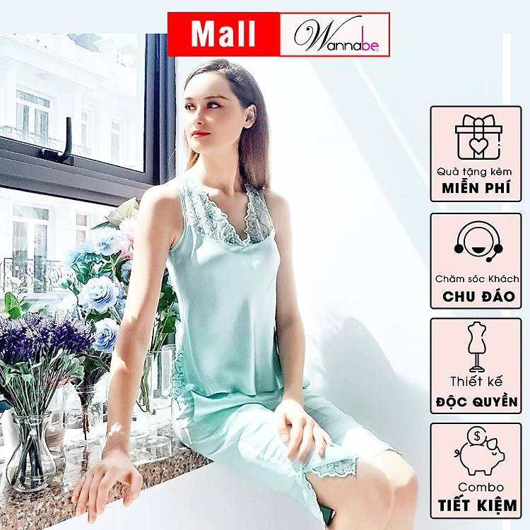 Đồ bộ mặc nhà phi lụa WANNABE bộ BLS04 đồ bộ lững bản vai phối ren xinh đẹp