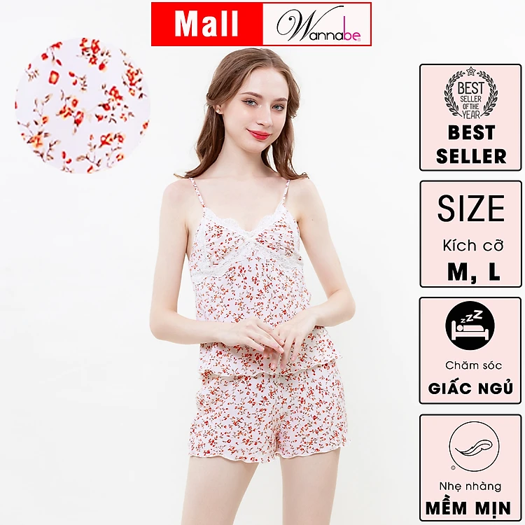 Đồ bộ mặc nhà WANNABE BSS93 đồ bộ quần sọt mặc với áo ngủ 2 dây nhúng phồng cúp ngực phối ren lượn sóng tạo sự đầy đặn