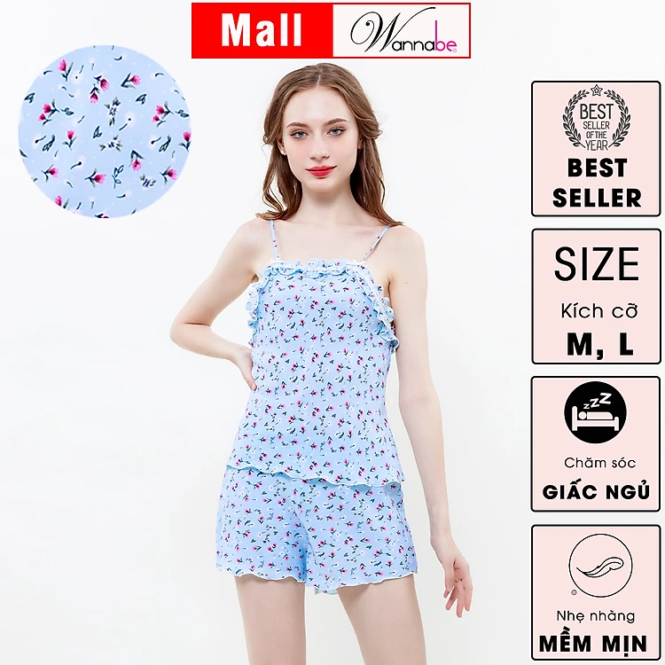 Đồ bộ mặc nhà WANNABE BSS94 bộ quần sọt áo 2 dây lụa mango mềm mịn in hoa nhỏ dễ cưng tôn lên vẻ trẻ trung xinh xắn