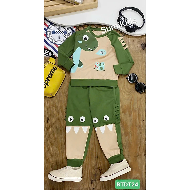 Đồ bộ ngủ dài tay cho bé trai bé gái hình khủng long từ 12-40kg chất cotton mềm mát