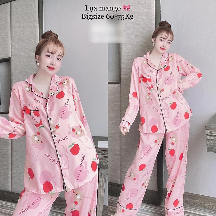 Đồ Bộ Pijama Lụa Mango Cao Cấp Tay Dài Quần Dài (gấu hồng/gấu đen/ô hồng) Bigsize 60-75Kg