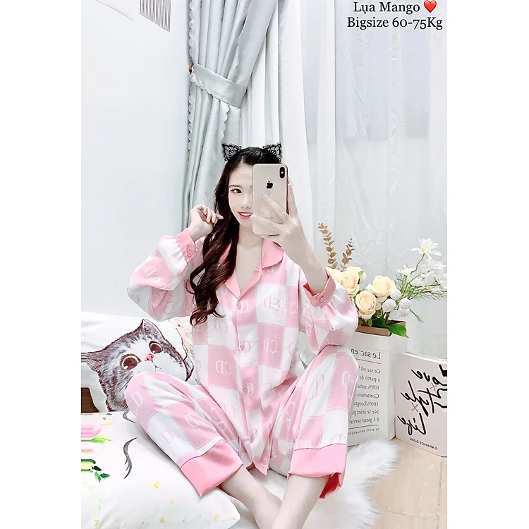 Đồ Bộ Pijama Lụa Mango Cao Cấp Tay Dài Quần Dài (gấu hồng/gấu đen/ô hồng) Bigsize 60-75Kg