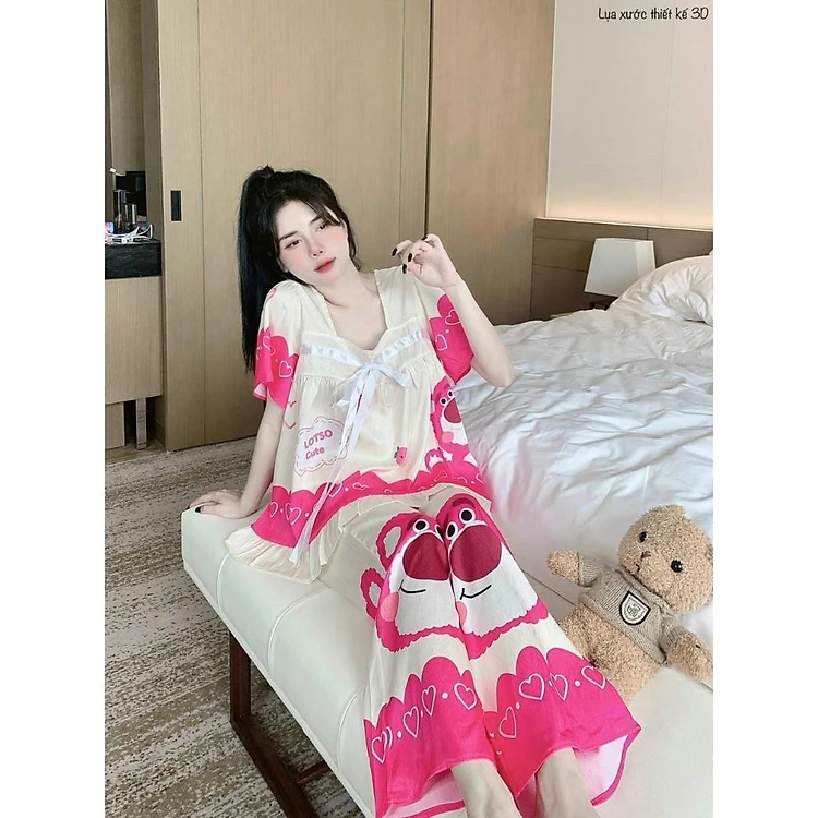 Đồ Bộ Pijama Lụa Xước Thiết Kế 3D Tay Ngắn Quần Dài (hồng/đen) Freesize dưới 58Kg