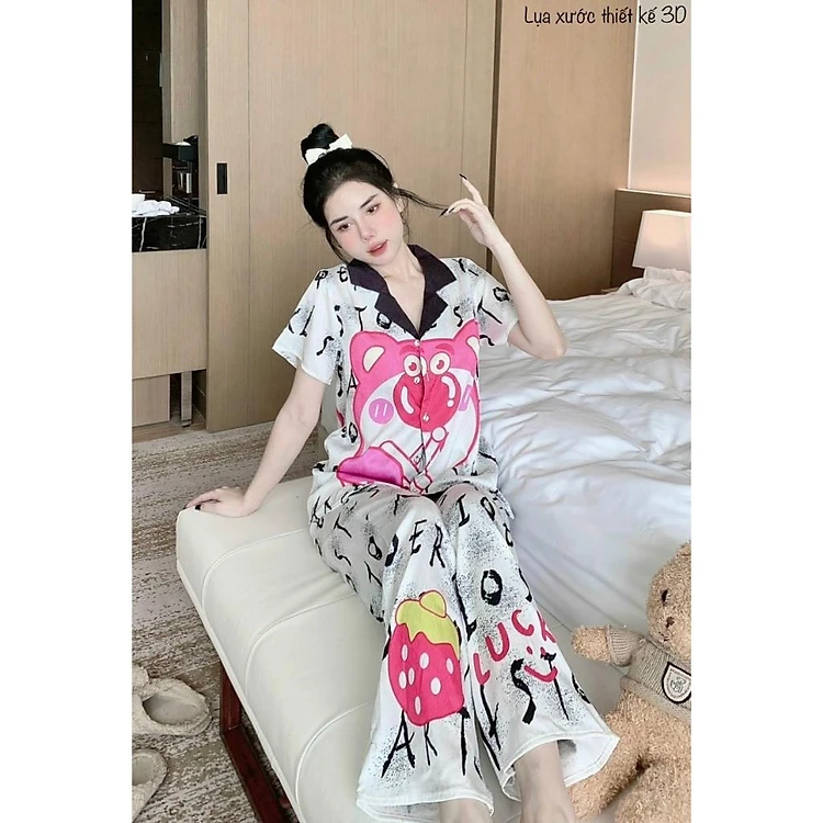 Đồ Bộ Pijama Lụa Xước Thiết Kế 3D Tay Ngắn Quần Dài (hồng/đen) Freesize dưới 58Kg