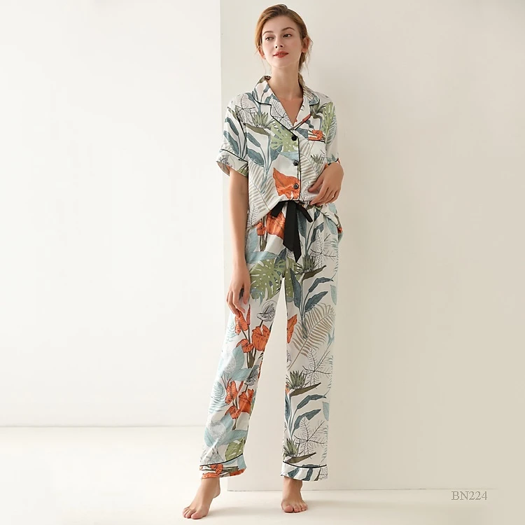 Kiểu dáng áo tay ngắn quần dài in họa tiết hoa lá sang trọng