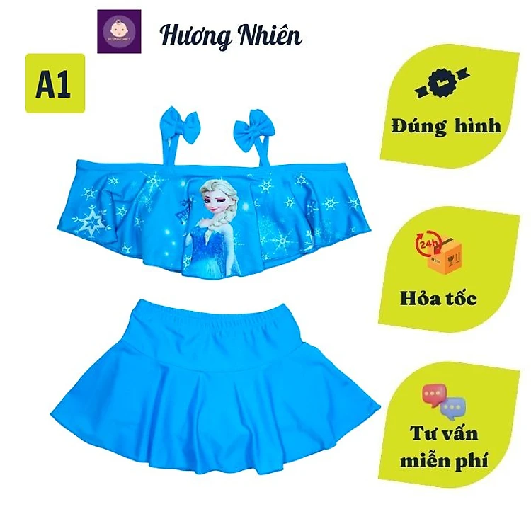 Đồ bơi hai mảnh cho bé gái hình Elsa từ 10-39kg - áo 2 dây có kết hoa quần giả váy tạo kín đáo
