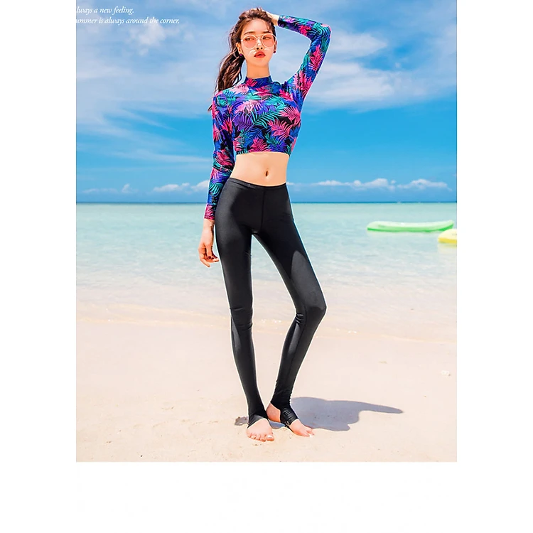 Đồ bơi nữ tay dài quần dài với thiết kế trẻ trung, năng động, sản phẩm bao gồm: áo crop-top tay dài, quần dài giúp bảo vệ làn da khỏi tác hại của ánh nắng mặt trời kết hợp quần chip bên trong. Áo có mút lót bên trong.