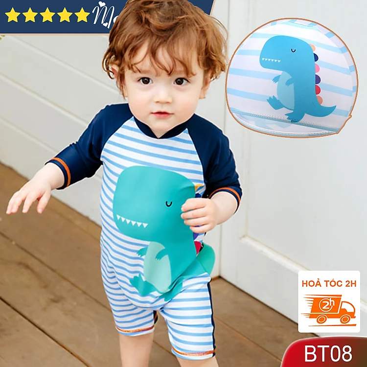 Đồ bơi size nhỏ cho bé trai, có kèm mũ, size từ 6m (8kg), mẫu liền thân giữ ấm, chất bơi đẹp, dày dặn, hình khủng long dễ thương | BT08