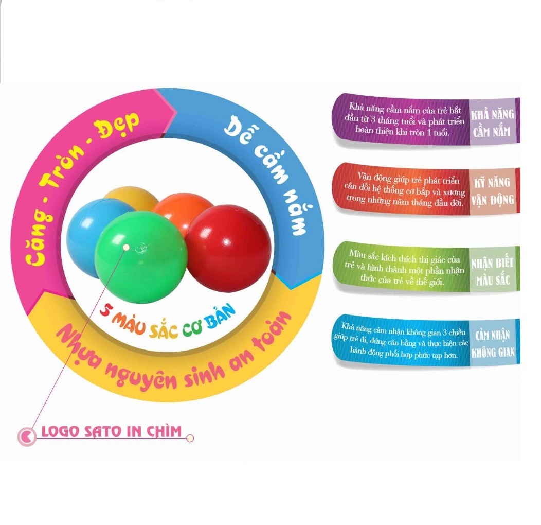 Bóng mầm non là loại bóng hình tròn làm bằng nhựa mềm, căng hơi và có kích thước nhỏ phù hợp với trẻ em. Là một trong những loại đồ chơi quen thuộc mà các bậc phụ huynh lựa chọn cho con mình vì đặc tính nhẹ, mềm, nhiều màu sắc và cách chơi đa dạng. Tuy nhiên hiện nay các sản phẩm dạng này trên thị trường hầu hết là sản phẩm có nguồn gốc từ Trung Quốc hay những xưởng gia công có xuất xứ không rõ ràng và không qua kiểm định chất lượng. Trước thực trạng đó, Công ty CP Đồ chơi An toàn Việt – SATO nhận thấy sứ mệnh mang đến những sản phẩm thay thể chất lượng cao cho trẻ em Việt Nam. Sato đã cho ra đời sản phẩm “Bóng mầm non đường kính 8cm – 10 quả″ để giúp các bố, mẹ có thêm những lựa chọn an toàn cho những đứa con thân yêu của mình