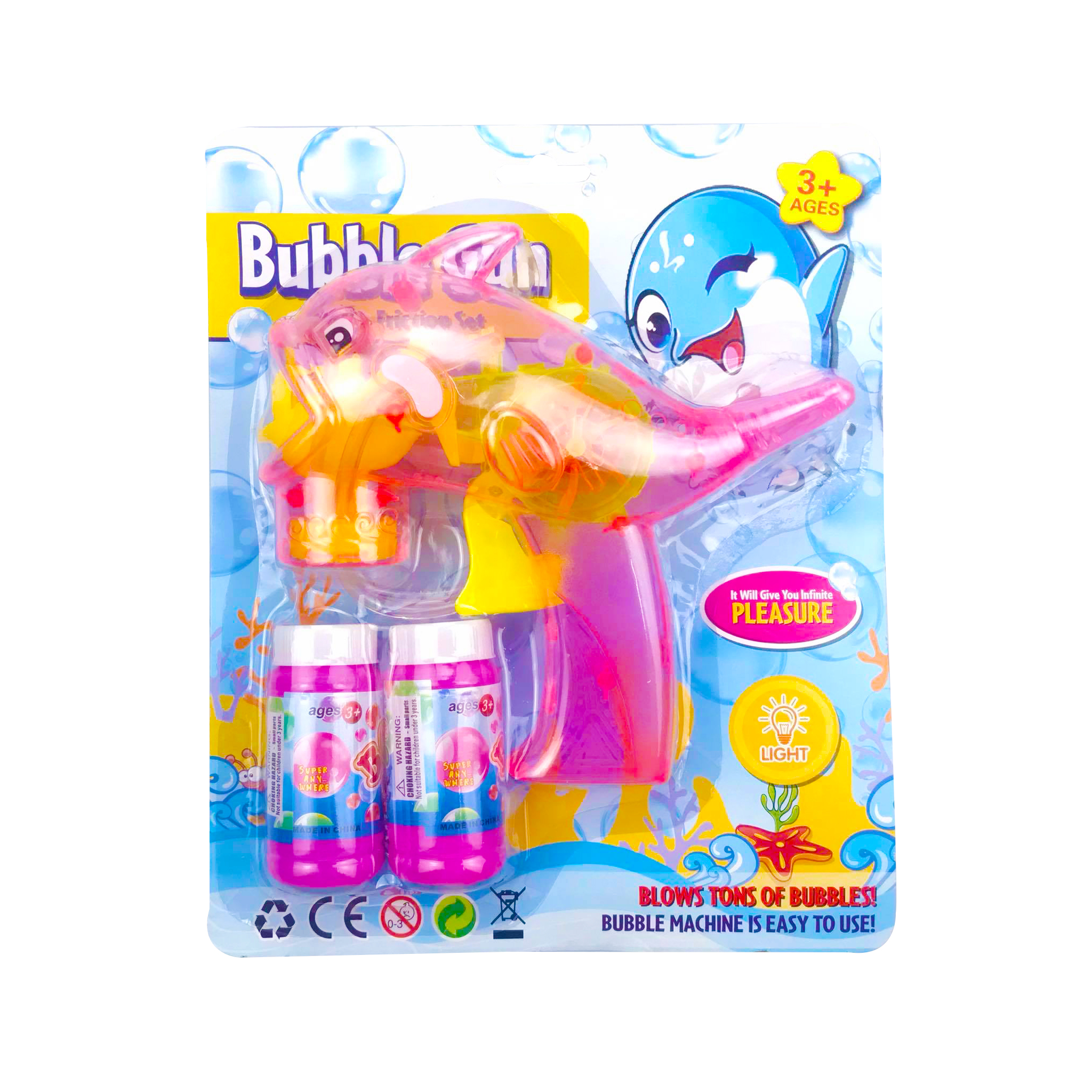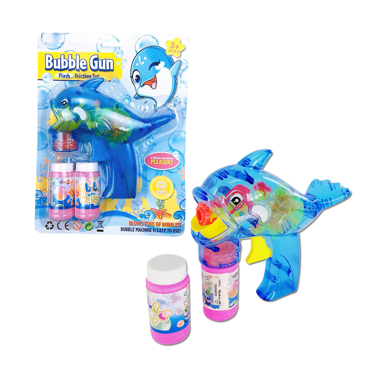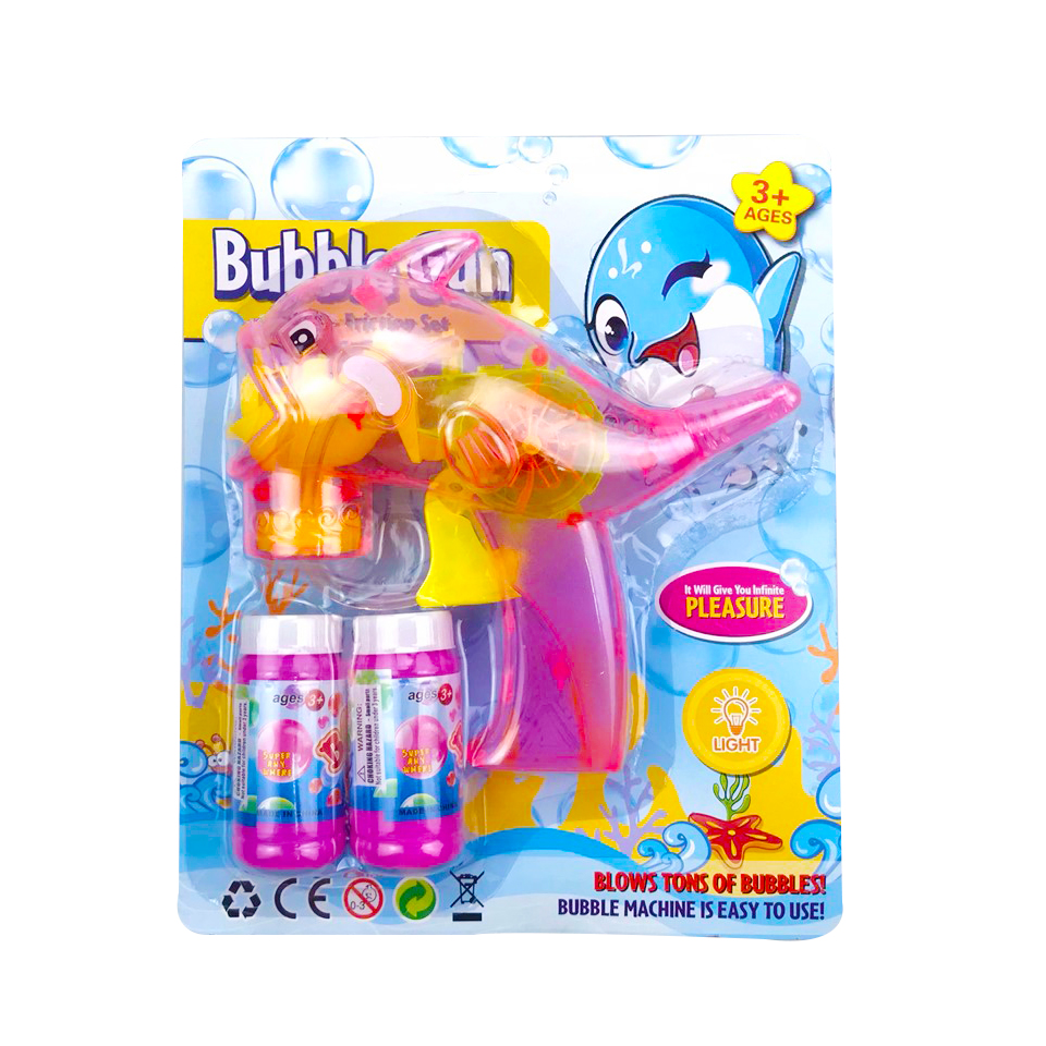 – Sản phẩm gồm: 01 súng bong bóng hình cá heo và 02 lọ dung dịch đi kèm