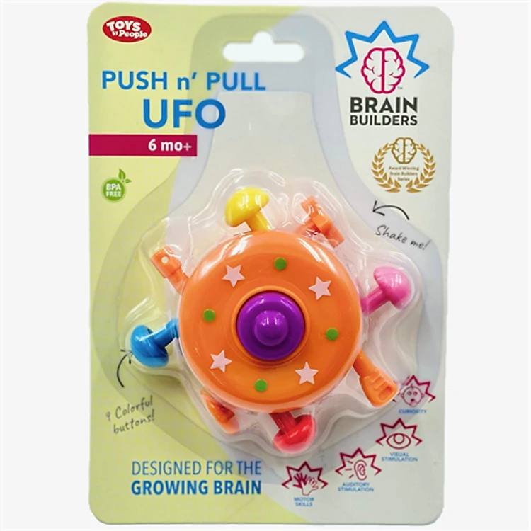 Push and Pull UFO có thiết kế hình đĩa bay nhiều màu sắc, với 8 nút có thể kéo và đẩy xung quanh đĩa bay, giúp bé phát triển các kỹ năng xúc giác quan trọng. Khi nhấn nút “đáp xuống” sản phẩm sẽ phát ra giai điệu vui tươi, giúp phát triển thính giác của bé.