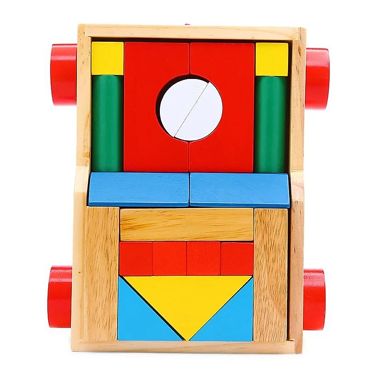 Gồm 25 khối chữ nhật, chữ nhật khuyết bán cầu, vuông, hình thang, hình trụ, tam giác, bán trụ. Xếp trên hộp thiết kế hình xe Jeep, có dây kéo.
