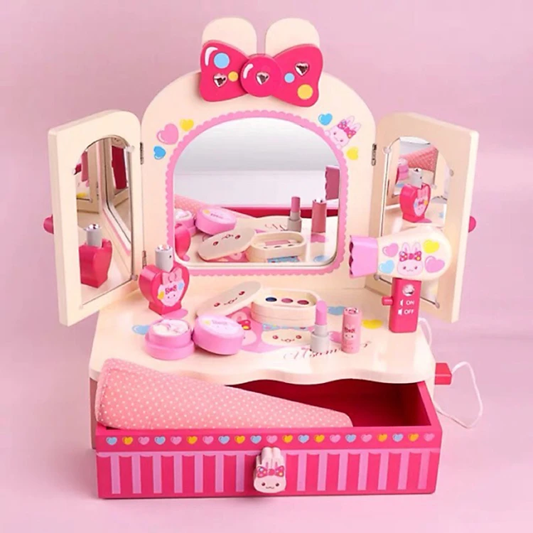 Đồ Chơi Gỗ - Bàn trang điểm họa tiết lơ hồng cho bé gái thêm đáng yêu và nữ tính 2 cánh Momo